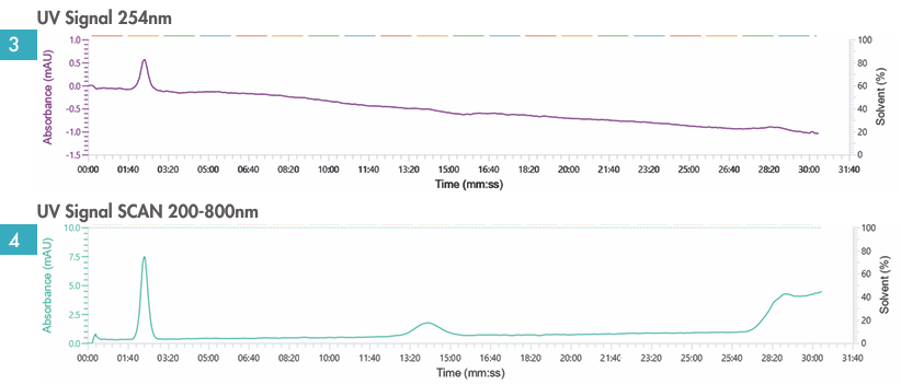 圖3與圖4:紫外檢測下化合物不可見。檢測初期首波化合物開始顯現(xiàn)低強(qiáng)度信號,但強(qiáng)度不足以實現(xiàn)有效收集